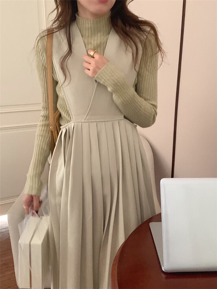 長袖 セーター プリーツワンピース ハイウエスト 2点セット 2カラー カジュアル 大人気